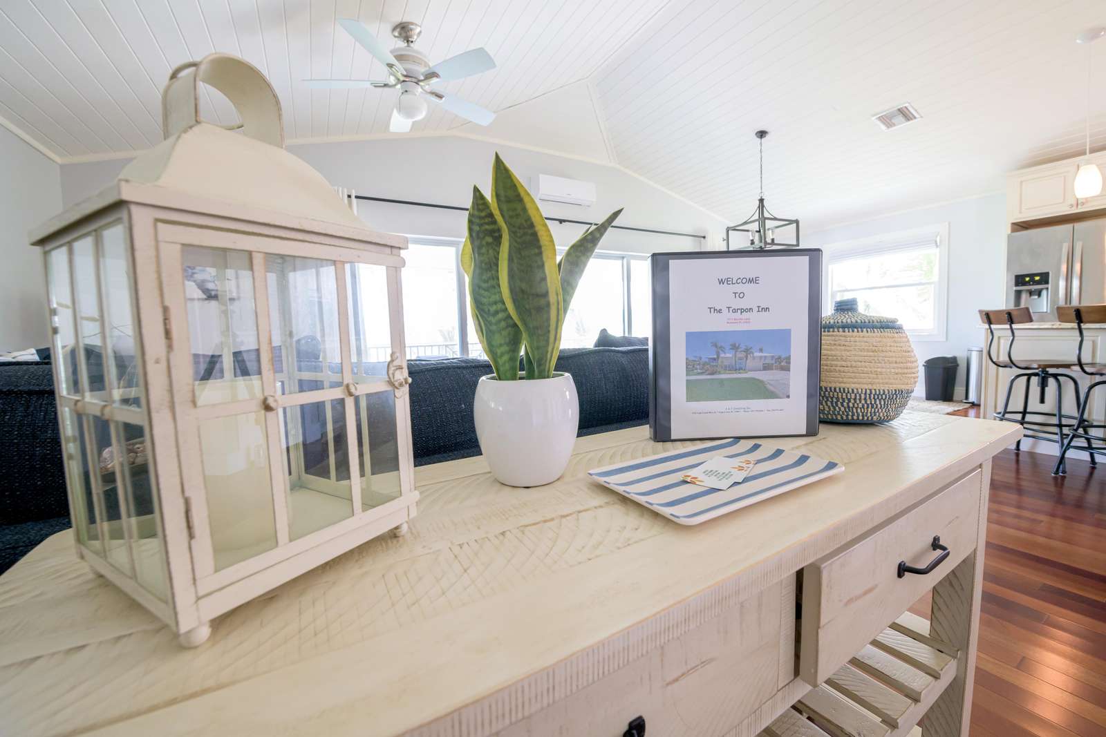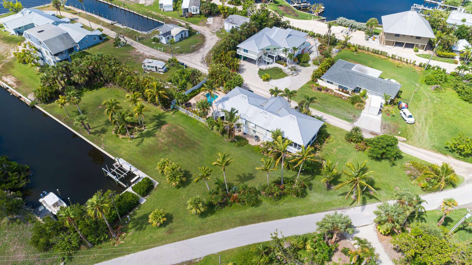 This beautifully Tropical-appointed stilt house is located on Bokeelia with a view of Charlotte Harbor from across the street and a waterway canal with a mooring post.
